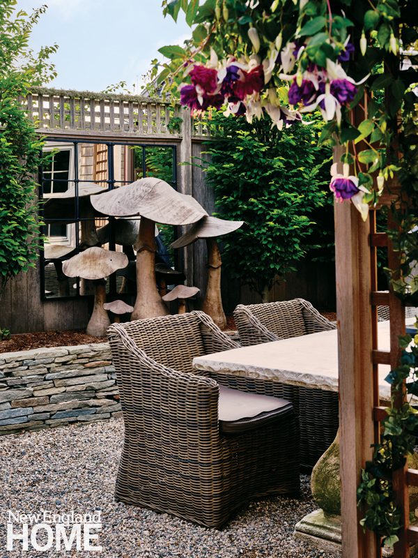 Much of the furniture came from Paton’s existing collection, some purchased while the family lived overseas, others when the designer owned a home-goods store in Harvard Square (witness the larger-than-life teak mushrooms in the backyard).