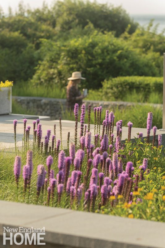 Vincenta took all challenges in stride, skillfully installing a rain garden filled with deep-rooted panicum, joe-pye weed, liatris, asters, and black-eyed Susans massed in sweeps of color. Similarly, other color-block plantings line the view corridor. Balconies beckon the family to bask in the view, while perennials around terraces lead the eye down to a gabion wall framing the water and coastal scrublands.
