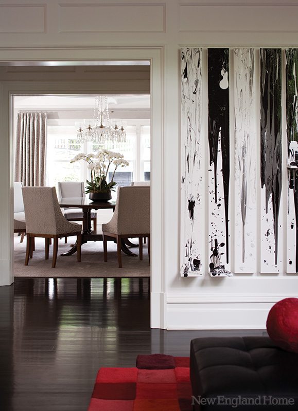 The extensive paneling and wood trim throughout the house is “transitional,” Mueller says, congenial to the Shingle style while keeping the focus on his clients’ contemporary artwork.