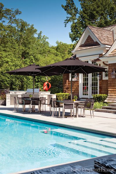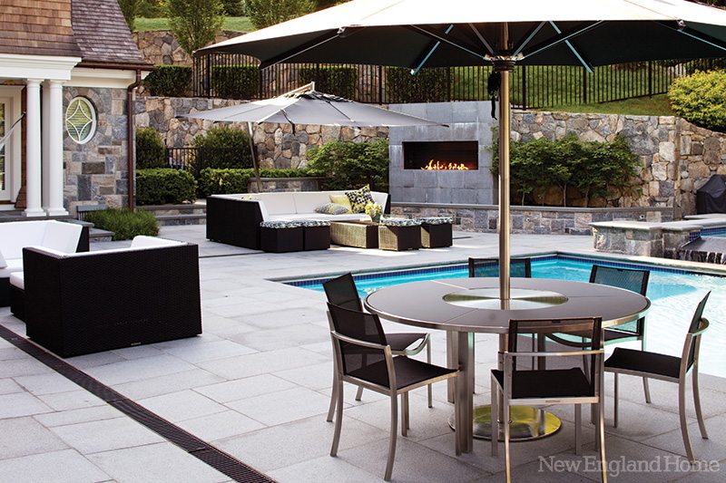 It was teardown time. They interviewed six architects before choosing Greenwich-based Steven Mueller. For the exterior of the new house, they settled on what the architect calls New England coastal Shingle style. “The real challenge of the site was that it was a hillside,” Mueller says. “But the Shingle style is especially suited to a sloping site.” The stonework seen so often on Shingle-style homes meant the house could be gently set into the landscape, appearing to rise from it organically.
