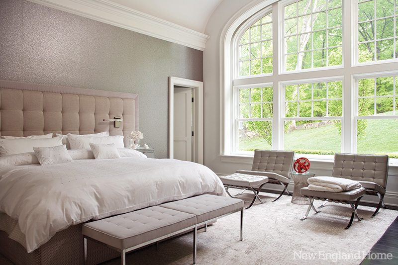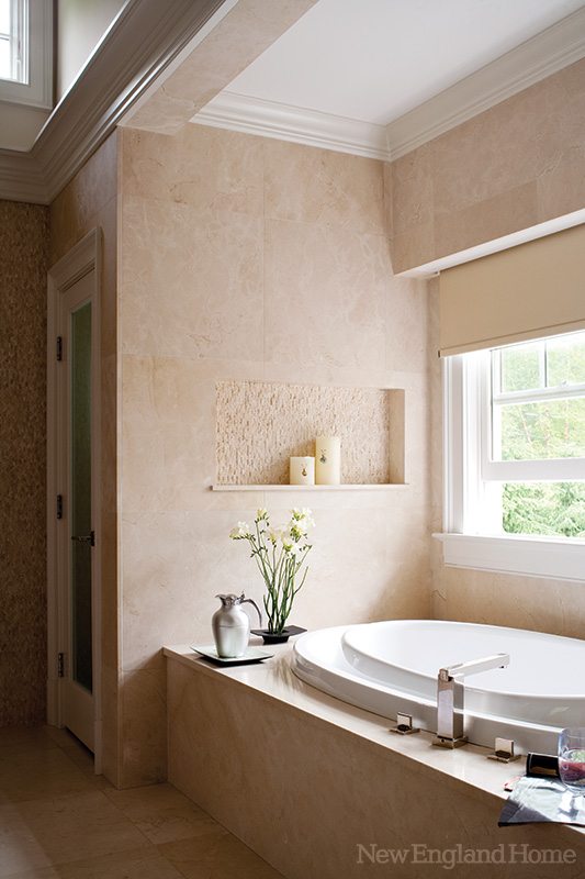 Spectacular could also describe the kitchen itself. Designed by Deane, Inc., of Stamford and New Canaan, the space is a pure, clean white accented with minimalist stainless steel. A large custom stainless-steel ventilation hood seems to float above two kinds of stoves—an induction cooktop and a more conventional gas cooktop. It’s all backed up by a wall of Calcutta marble. “We could be really bold with the marble,” says Deane’s Veronica Campbell. “This particular piece was chosen because of its dramatic veins.”