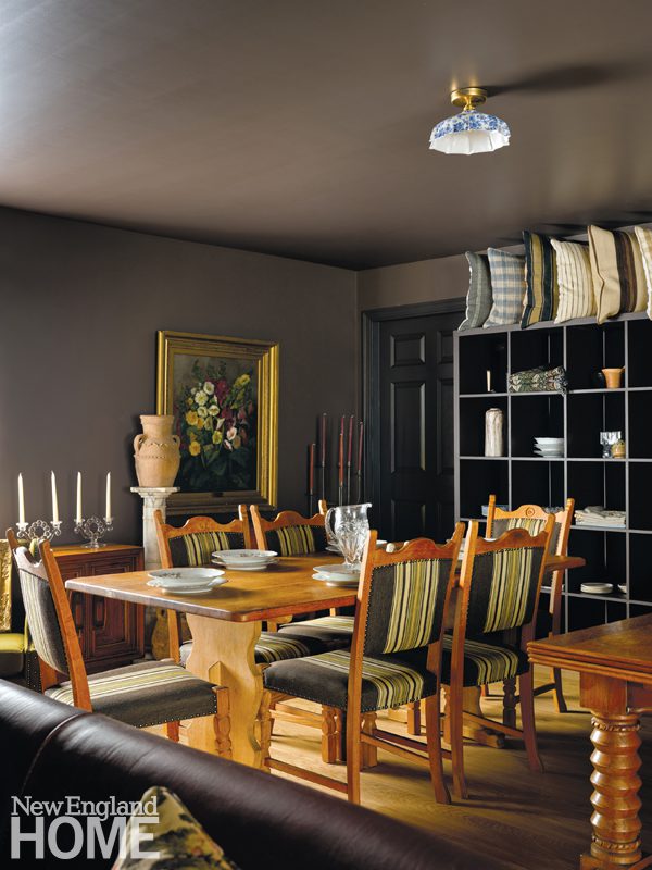 Vintage tables, chairs, consoles, sofas, and even light fixtures figure prominently in the vibey space that Oravec painted in shades of dark brown. One of the first elements many people notice are the flush-mount light fixtures with their ceramic blue-and-white toile shades. “Everyone loves those,” admits Oravec. The lighting corresponds with the collection of porcelain plates displayed behind the counter.
