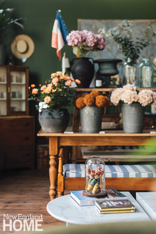 So in December 2024, Smith Coughlin, who attended high school in nearby Yarmouth, opened Le Marchande in the heart of Falmouth, Maine. The 3,000-square-foot shop, tucked under The Wyeth luxury condominium complex, features a mix of antiques (predominantly from France and Turkey), artwork (everything from Slim Aarons prints to vintage oil landscapes), and gift items (like candles and books). Vessels of muted faux florals from Abigail Ahern, lighting from Currey & Company, colorful glass coupes, and sumptuous linens give the space a decidedly Parisian vibe, hence the name, an artistic reimagining of la marchande, French for “the merchant.”