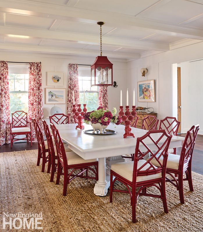 With its two distinct sitting areas, the living room is the heart of the home, where friends and family, including Rylee’s two daughters and two dogs, gather on the weekends, in the summer, and whenever Rylee can get away from her New York City home and design studio. (Just as the coast inspired Homer to create, the three women enjoy painting in watercolors when they stay at the house.) The screened porch is another favorite gathering spot, as is the formal dining room, studded with pops of red, where “big dining room dinners” take place at every opportunity.