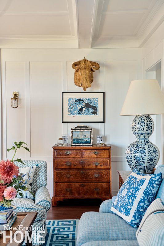 The beach just steps away from its door, the seven-bedroom house is welcoming, brimming with wicker and rattan and awash in shades of sea and sky. It’s filled with antiques and works by Maine artists—including plenty of seascapes. Both elements complement Rylee’s own custom designs, like the living room’s immense striped rug with its Greek key border. Rylee had it woven on a special loom in a factory in India run by women.