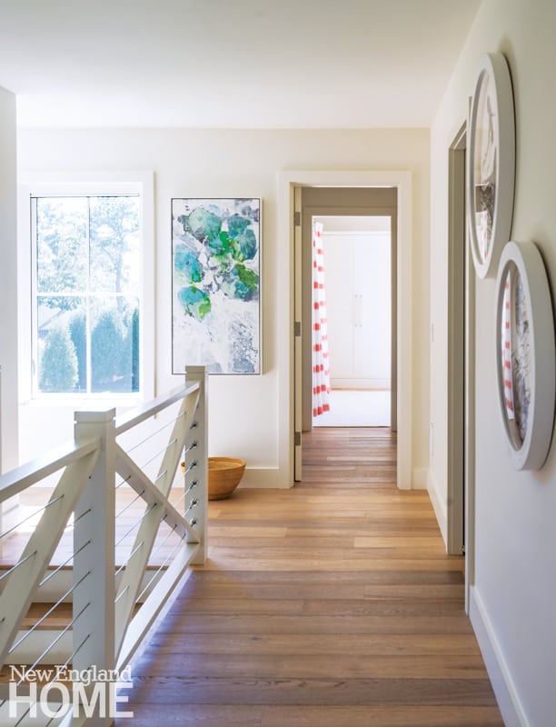 “The homeowners wanted a soothing retreat, which drove the color palette,” the designer says. “They were intent on white being the overarching color, for its brightness and freshness. A single wall color was used throughout to purposefully maintain the calm and quiet aesthetic, but we added soft color to the base here and there.”