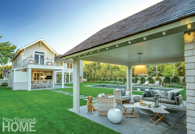 “We’re part of a neighborhood,” says the wife, “so we wanted our home to strike a balance between being unique and still feeling like a Cape Cod house.” The front elevation is charming, complete with a traditional farmer’s porch framed by blue hydrangeas. In back, Horiuchi sketched out a minimal, contemporary landscape. “Instead of one large central terrace,” she explains, “there are a series of smaller outdoor living spaces: a dining terrace with an outdoor grill, a covered terrace at the pool cabana with a fireplace, and a smaller area for chaises by the pool.”