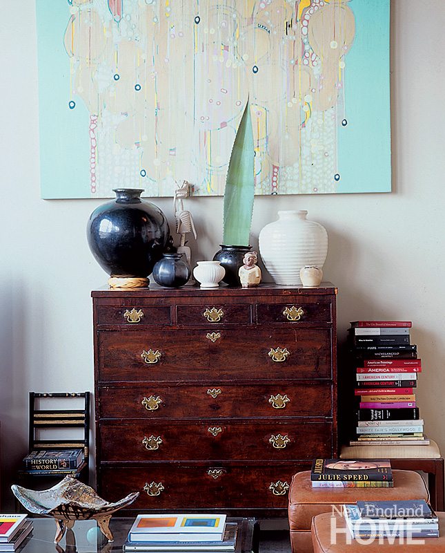 The other story here is the copious amount of art on display. Evans estimates that they have around eighty pieces gracing the walls at any given time, rotating new pieces in frequently. Most of them are works by their talented friends, says Evans, including two large abstracts by Laurel Sparks, one of which is currently on loan to the DeCordova Museum in Massachusetts.