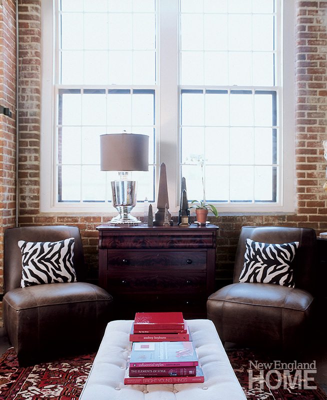 The Providence architectural firm Durkee, Brown, Viveiros and Werenfels got this party started, restoring the nineteenth-century complex to its industrial roots. In Evans and Cabral’s loft, that included removing a wall that had obscured the beautiful arched windows and adding a spiral staircase up to a revamped space above the loft that was once an elevator override system. “We essentially removed years of ‘upgrading,’” says Michael Viveiros, lead architect on the project. “We try to expose as much of the original building as possible and celebrate what there is about it that’s industrial.”
