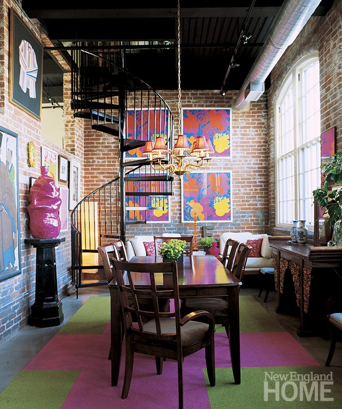 Step inside today and be struck by colors—hot pinks, golds, aqua—art-covered walls, layers of décor, a sense of whimsy. Sure, it has traditional loft features: amazing twenty-foot ceilings, exposed brick and vents, oversize original windows and a pedigreed industrial history as a foundry, laundry company and most recently, a furniture showroom. But this is loft living in double time.