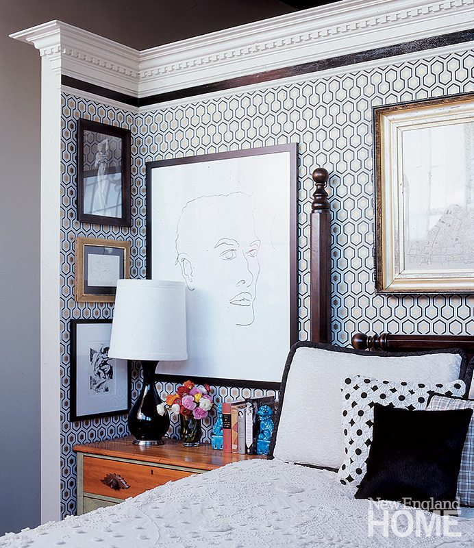They commissioned an artist friend to add intricate molding to the wall dividing the hallway from the bedroom. The wall is embellished with a reissued geometric David Hicks wallpaper from Cole and Son to create a headboard of sorts. “It’s like a stage set. It’s the suggestion of a traditional bedroom,” says Evans.