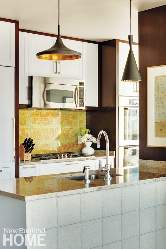 For a jolt of color, Birkerts gave a Knowlton Brothers dining table with crisscrossed legs a coat of Benjamin Moore’s Mexicana—a color that she describes as “a mix of coral, persimmon, and terra cotta.” At night, a sculptural, multi-arm, raw-brass light fixture by Apparatus Studio in New York seems to mimic the twinkling skyline out the window; it’s suspended from a ceiling covered with a hammered gold wallpaper that “adds texture, warmth, but not glitz,” she says, noting how the gold paper references the lining of the two Tom Dixon pendants over the counter in the kitchen.