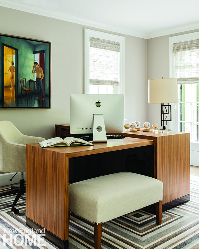 Creating contrasts that give a room just the right balance comes easily to Daher. Case in point? The striking art she carefully helped the owners select. Contemporary and eye-catching, the paintings, woodcuts, and photos put a youthful spin on the classic architecture. Against the muted palette, every piece is a statement, but perhaps none more so than the geometric work by artist and Rhode Island School of Design professor Deborah Zlotsky in the library turned living room. Its colors are reflected in the chandelier’s mirrored bottom, doubling the painting’s dramatic effect and, most assuredly, awing visitors. “It’s a showstopper,” agrees Daher.