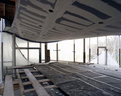 In 1999, Thurber was selected to be an artist-in residence at the Boston Athenaeum, just as the library was undergoing extensive reconstruction. This was an inspired choice. The photographs Thurber took over the course of two years are records of the construction project and ever so much more. Her elegant images are tinged with violence, but piles of rubble or decimated stairwells are always balanced by a deliberate grace note—a delicate pattern of refracted light from an unseen window or a stately Corinthian column—that speak of both renovation and resurrection.
