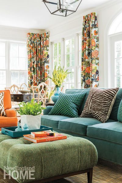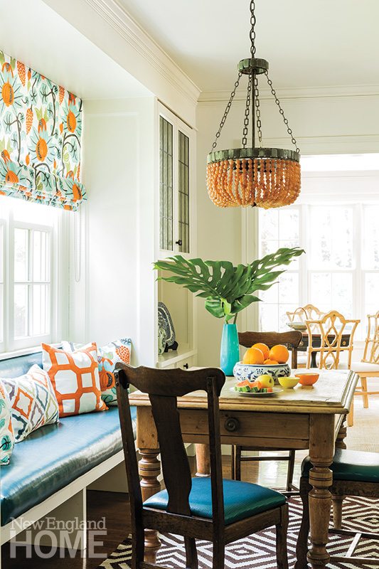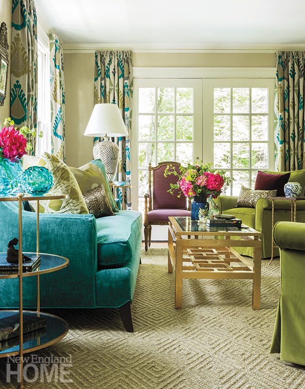 The two soon put their heads together, collaborating on exactly the sort of surprising yet entirely comfortable mix of colors and patterns that had initially drawn Lipton to Rosenfeld’s work. The hues of blue and green that Lipton favored are common choices, Rosenfeld says. But to the designer’s delight, her client was game for snazzing things up with the bright colors in the fabric Rosenfeld suggested for the family-room drapery. “That fabric was mind-blowing to me,” says Lipton. “As soon as Katie showed it to me, I knew I had to use it.”