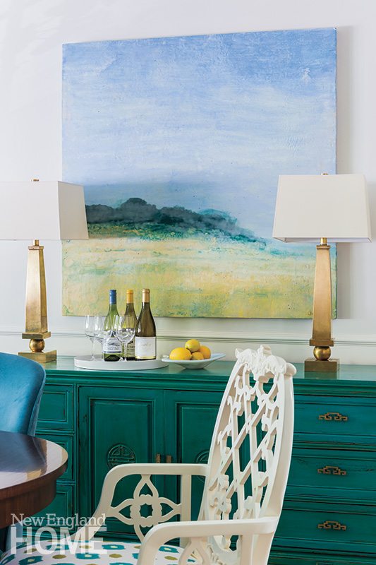 “Very few clients actually let me use as many vintage pieces as I like,” says Rosenfeld. “Most people are skittish about things that have patina or wobbly doors, but I believe there should be that crust so that your home feels bespoke. So when someone gives me the freedom to do that, it makes the hair on the back of my neck stand up in excitement. With Amy, I’d see something on 1stdibs.com or OneKingsLane.com, and she’d let me buy it without any hesitation. She was at a Red Sox game when I emailed her a picture of the buffet I saw on OneKingsLane and wanted for her dining room. It was the most shocking shade of teal, and she told me to just go for it.”