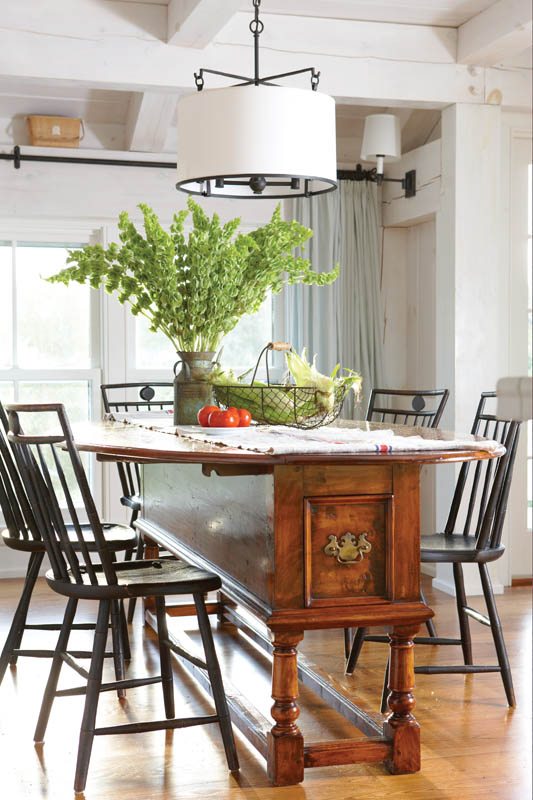 In the upstairs living room a window seat hugs the perimeter, broken only by the fireplace with its black slate hearth and a mosaic surround of frosted glass ovals that look like tumbled beach glass. Easy-going slip-covered furnishings, mixed with a hand-carved rocker and a painted chair the homeowners found in an island shop, are in keeping with the homeowner’s desire to keep things simple. “I wanted a non-fussy house,” the wife says. “This is a house you can just sweep out.”