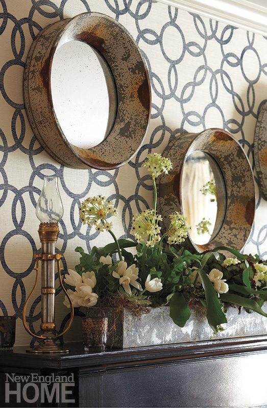 From there, the room fell into place. A table of reclaimed wood on an iron base that seats a dozen people comfortably but keeps a low profile stands atop a wool-and-silk rug with a fresh, contemporary pattern of blue on white. The fireplace was painted navy blue (“my go-to color,” says Susie, and a hue John is partial to, as well), and, in a play on the traditional idea of a mirror over the mantel, Bow hung a trio of round mirrors with deep, distressed frames above it. “Their shape echoes the wallpaper, and they add dimension and depth,” she says.