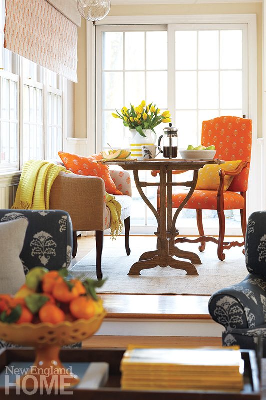 The kitchen lies two steps up from the living room, and although it’s awaiting a more thorough renovation, one end of the space has been revamped to become one of Susie’s favorite spots. Replacing the table and four chairs that once sat against the windows is a cozy sitting area with a loveseat, a table just big enough for tea for two, and a chair outfitted in a fabric whose background is the color of a fresh-picked orange. John isn’t wild about orange, Susie says, “but it’s my favorite color, so we said we’d just do a few pillows or accents. He laughs now and says we did too much orange. But he loves it.” The settee is backed in burlap and fronted with an orange-on-white print that’s the reverse of the chair fabric.