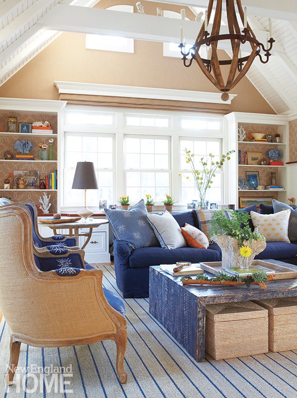 For this first change to the home’s shared spaces Bow began with a quiet color scheme to satisfy John’s penchant for neutrals. Above the white beadboard paneling, the walls wear a burlap wallcovering that looks beige at first glance but is enlivened with thread-narrow stripes of orange, gold, and brown. Not one to dispense with things that work, Bow kept the checked roman shades at the windows. The coffee table stayed, too, now centered on an oriental rug layered atop a sisal carpet. A pair of cushy lounge chairs that Susie says were covered “in some old chintzy thing” were reupholstered in gray-blue linen with a pattern inspired by the fleur-de-lis. They stand across the coffee table from a new sofa covered in neutral linen heaped with toss pillows in vivid orange, yellow, and purple—a nod to Susie’s fondness for bright hues.