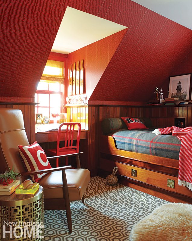 On the heels of that success, the two moved on to the son’s room. Years earlier, Susie and John had installed a built-in bed and paneling that gave the snug room the look of a ship’s quarters. Bow added deep-red vinyl wallcovering above the paneling. David Hicks wall-to-wall carpeting with a geometric pattern of navy and white further enlarges the space. A leather-cushioned recliner and a Jonathan Adler side table add a dash of sophistication.