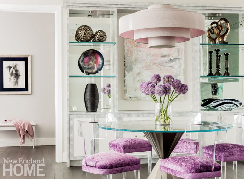 Throughout the home, the clients’ favorite colors—pinks and purples—make an appearance. Even the kitchen gets into the act, with counter stools that add a punch of purple drama to the breakfast bar. The colors never become overbearing, however, thanks to the neutral tones that form the backdrop. And Fine was careful not to sacrifice function to beauty; the fabric on those stools is actually vinyl with a subtle shine, “so it has lots of style, but you can wipe it down with a sponge,” she says. “They don’t have to worry about eating on it or spilling red wine.”