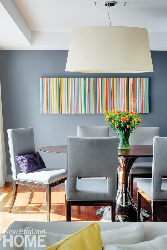 A striped painting by Michael Hoffman, also found at Jules Place, presides with a good-natured sense of order and authority over the dining table. The table’s metallic oval base joins Hoffman’s painting in yielding rich, reddish colors in high contrast with the gray lacquered walls by decorative painter Lynda Stephens.