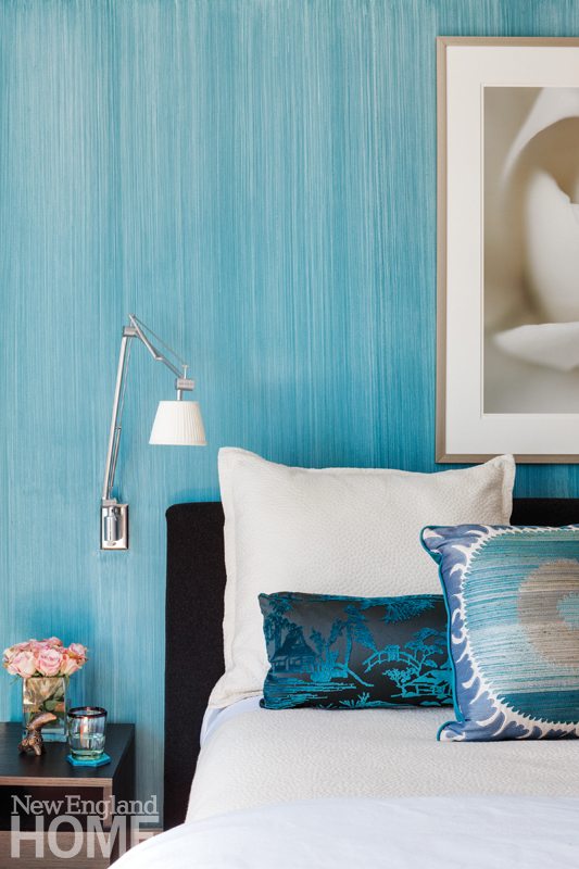 One more blue exception: the Fiji-blue strié treatment Stephens gave the master bedroom walls. Light and dark neutrals—the charcoal-hued headboard and white bedding, a lamb’s wool rug, and a black-and-white flower photograph by Debby Krim—stand out against the luscious blue.