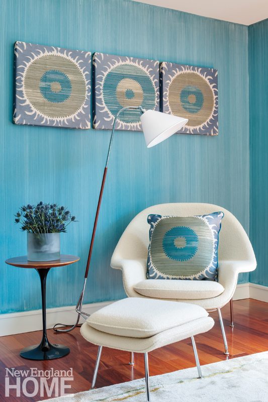 “The wife wanted a place where she could sit if her husband was off in the living room watching a game,” Rivoli says. “So opposite the bed, I created a seating area with the classic Knoll Womb Chair by Eero Saarinen. I also had some leftover Suzani pillow fabric from Donghia, which I framed in triplicate as artwork.”