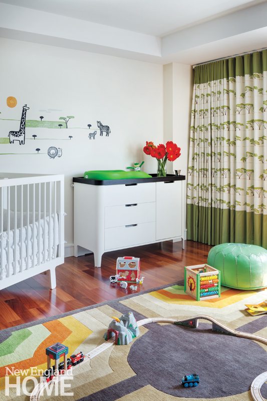 The guest bedroom soon evolved into a baby’s room, as the couple welcomed a baby boy—“though I designed it not so babyish that he couldn’t grow up in it,” says Rivoli. Fabric from Boston’s Mally Skok depicting the Botswana trees of her home continent set the African motif repeated by the wall decals.