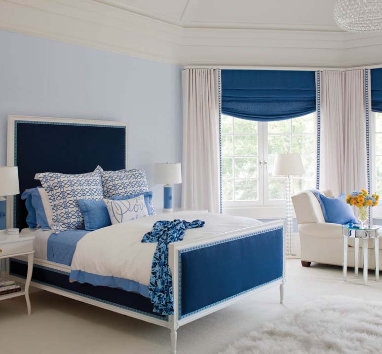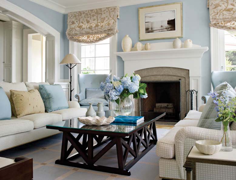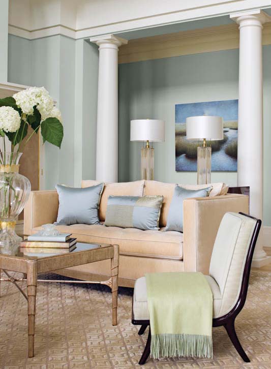 “My first concern was to take full advantage of the home’s breathtaking views across lushly landscaped, rolling acres to the water,” says the designer. Water and light were her starting points. “I used a palette of misty blues with hints of sea and sky. I wanted to bring the outside inside.”