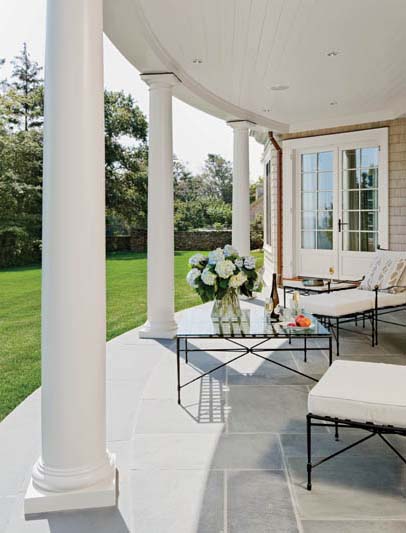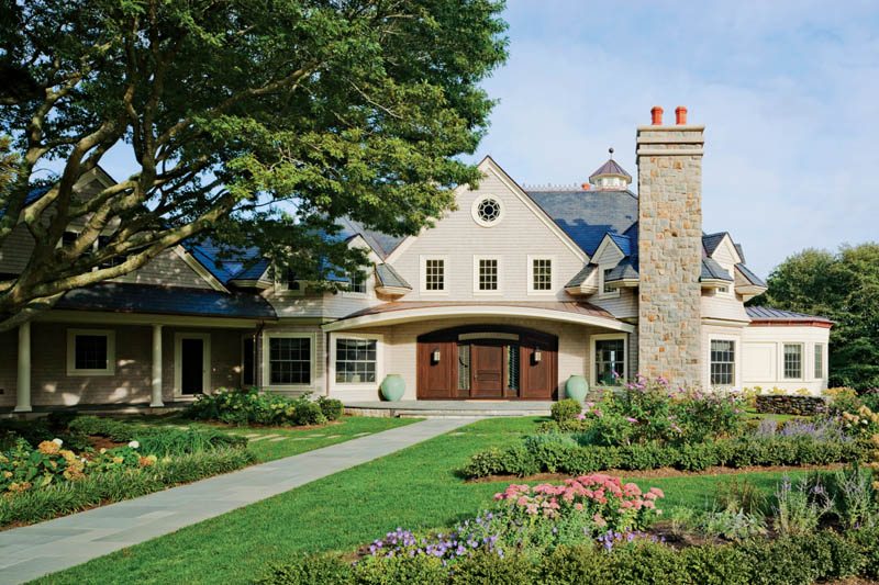 To soften the approach to the five-bedroom, 10,000-plus-square-foot house, a bluestone walkway through a garden of purple and white annuals and perennials was set at forty-five degrees. “We didn’t want an overpowering entryway,” explains the wife. “We want guests to feel relaxed and welcome as they walk through the garden to the front porch.”