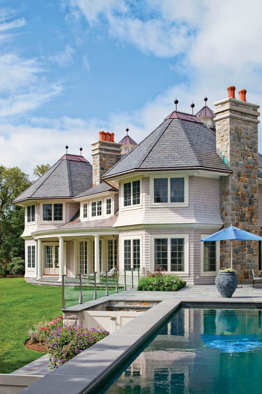 To get a better idea of what his clients wanted, Cullion and the husband drove around Newport on an impromptu architectural tour. “He pointed out things he liked,” explains Cullion, “such as a massive stone chimney, interesting rooflines, an elegant oversize front door, decorative roof cresting on a Queen Anne, as well as things he didn’t like. That was invaluable. I also learned that he and his wife value designs that emphasize symmetry and proportion.”