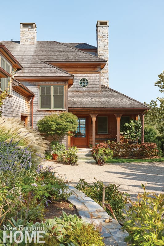 Far from the historic dictates of Edgartown, the couple embraced a more contemporary look, turning to architect and family friend Gregory Koester. Shingle style from the front, the house recalls area coastal homes, but the back opens up with a stone-steel-glass exterior that shakes off any attempts to define it.