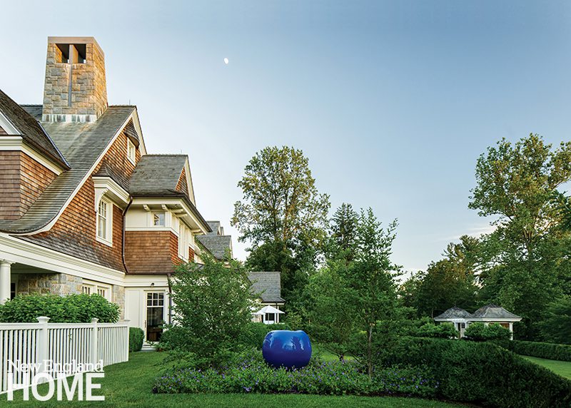 “It was definitely a challenge to get each aspect of the landscape in place,” says Heather Harris, senior landscape architect and project manager. To solve for all elements, the team created an upper terrace alongside the house and introduced a grassy slope with granite steps that lead down to a formal lawn adjacent to the pool. Behind it, the site slopes down again to a tennis court at the rear of the grounds.
