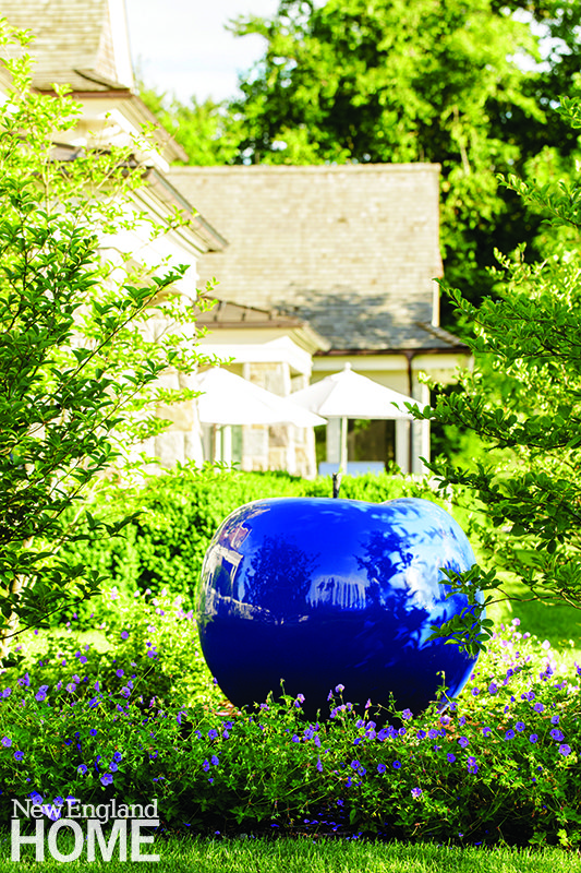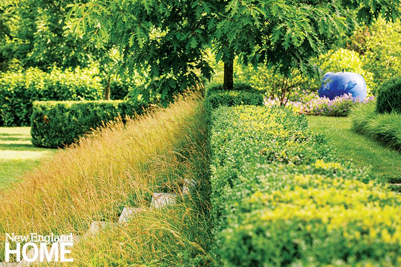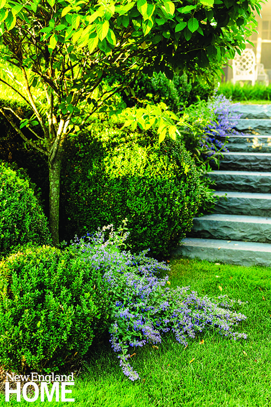 Fescue and bluegrass paired with shrubbery such as smoke bush and boxwood are unfussy yet sophisticated plantings that help “ground the house to the landscape,” says Harris, without “taking away from the architecture.” In other spaces, cherry trees, nepeta, and hydrangea add subtle yet colorful seasonal interest.