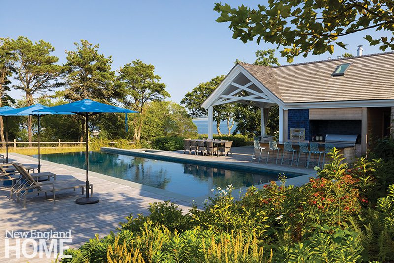 The fact that Thompson earned two master’s degrees, one in landscape architecture and one in architecture, from Harvard University speaks to her desire to balance home and land. At 9,500 square feet, the house is extensive but wears its floor plan modestly. Gentley Bondeson, project manager and lead architect, explains: “The house heightens the experience of the landscape, prioritizing the site, water, and sky.” Windows maximize light and views of the ocean and nearby Chappaquiddick. Porches and terraces—screened and open—invite everyone outside. A dramatic pool pavilion/outdoor kitchen showcases crisscrossing beams above billowing shrubs chosen for blossom and texture.