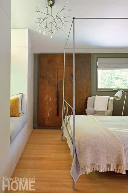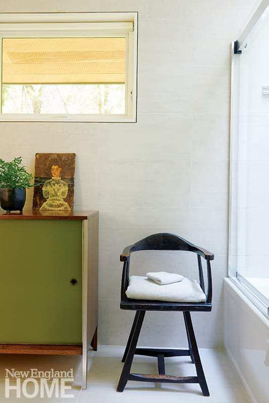 Upstairs, the home’s midcentury provenance is played up with simple architectural details, streamlined modern furniture, and the owner’s collection of contemporary art. Much of the furniture came from her previous homes, often cleverly made over by Reich. A pair of living room chairs that once had dark mahogany legs and fabric seats now sport sleek leather and wood bleached a honey hue. The sofa, too—a piece originally built at Val-Kill Industries, the Hyde Park, New York, furniture company founded by Eleanor Roosevelt—was redesigned and re-covered to better suit the space.