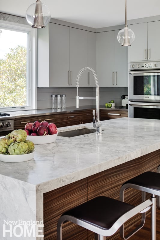 In the kitchen, gray cabinetry, stainless steel countertops, and a waterfall-edge island swathed in White Fantasy quartzite combine for a clean aesthetic and meal-time efficiency, and echo the muted, neutral palette used throughout the house.