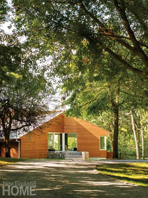 Inside, updated mechanicals and insulation created a more energy-efficient envelope. Outside, a new standing-seam, coated aluminum roof streamlines the structure’s silhouette. Exterior walls reclad with tongue-and-groove Western red cedar planks—without corner trim—hide drainage cavities and, says Murdough, “create a very taut, clean, and quiet” appearance. At the entry, he installed a new glass door and side panels that appear to cut into the building, and transformed the adjoining stoop into a bluestone patio with a modern steel handrail.