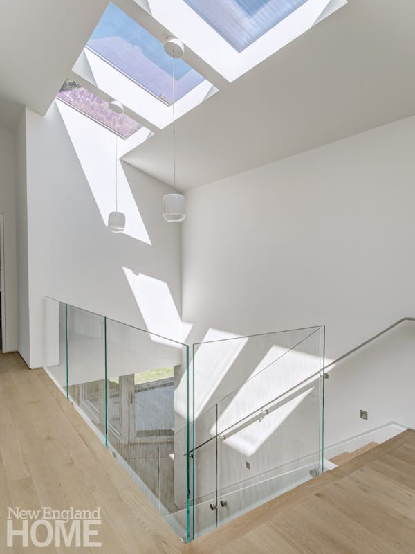 The emphasis on sight lines and natural light carries deep into interior spaces, too. A frosted panel between kitchen and entry, for example, lets the homeowners control for privacy and filter daylight. Nearby, the stairwell features its original skylights but was updated with a glass baluster.