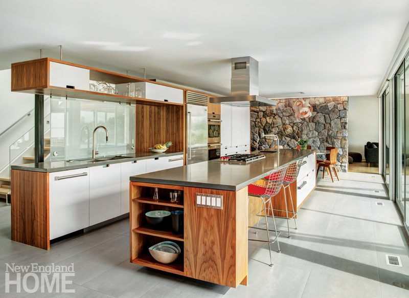 The new fireplace is a large-scale, structural element that enhances the minimalist, open-plan construct. Its raw materials also characterize the homeowners’ aesthetics—clean, midcentury modern, a touch industrial. Walnut casework and accents add warmth throughout, while bright-white plaster delivers a crisp backdrop. “It’s a very quiet palette,” says Murdough, “with the intention of highlighting the landscape.”