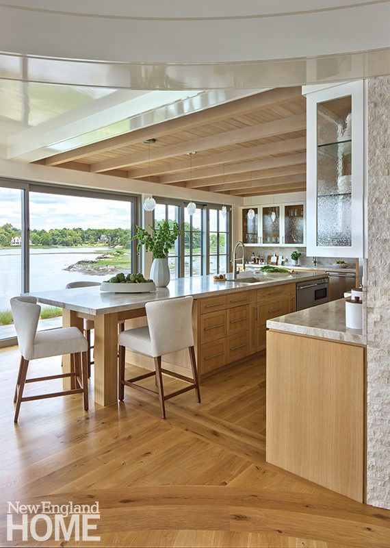 Song or story, the project began with a remarkable site, a long arc of shoreline along a quiet saltwater cove. Initially, the homeowners, an empty-nest couple with five adult children, considered renovating and adding to the 4,500-square-foot ranch-style house where they had lived for many years. The rambling structure did not meet current setback and floodplain requirements and had some quirky idiosyncrasies such as doorways just six feet high. Cost and wish-list evaluations led them to scratch those plans in favor of building a new house that would allow them to better take full advantage of the site.