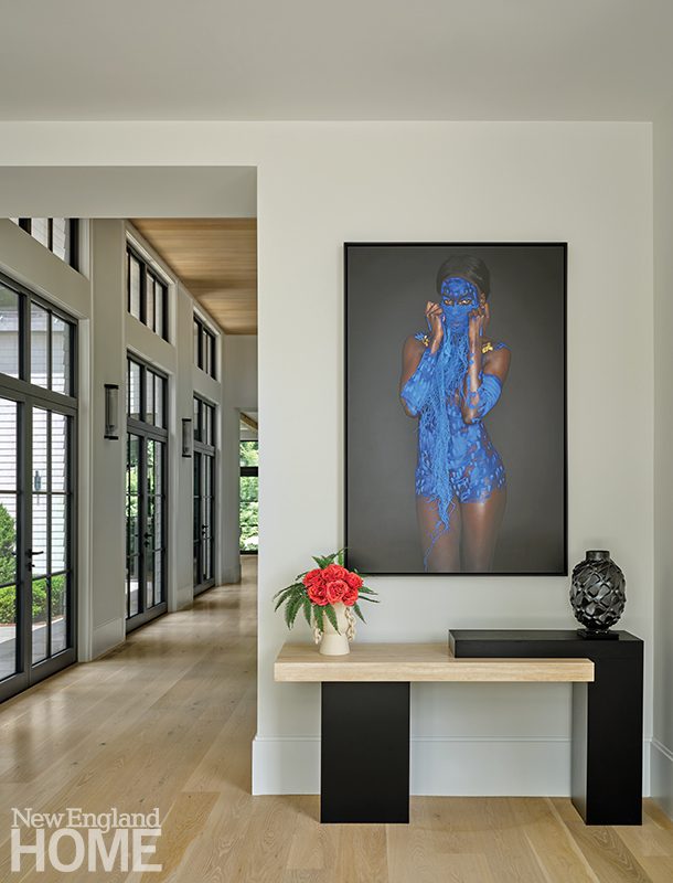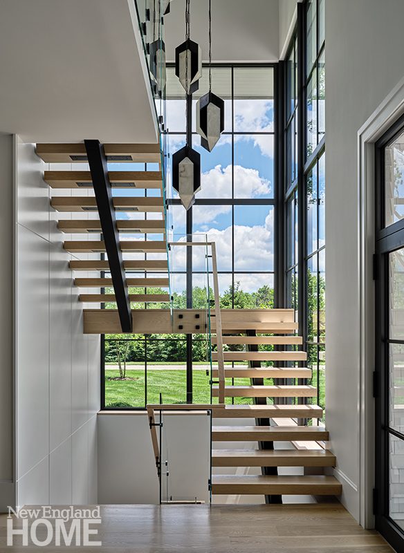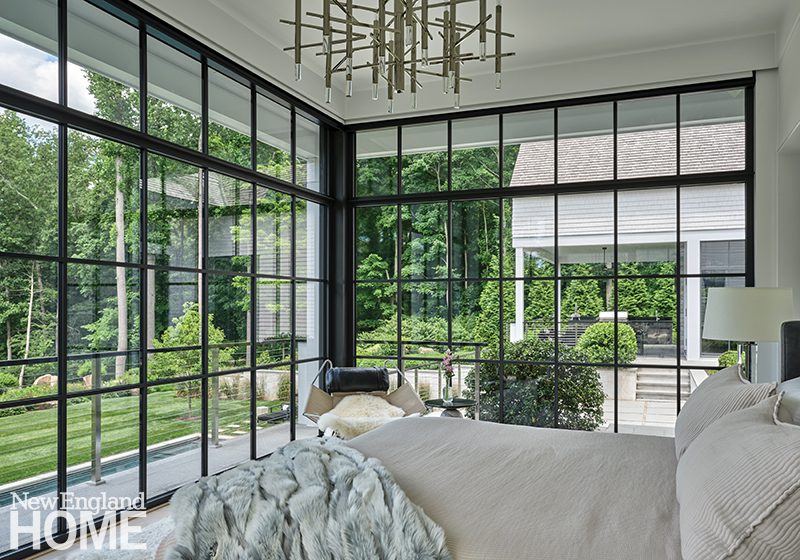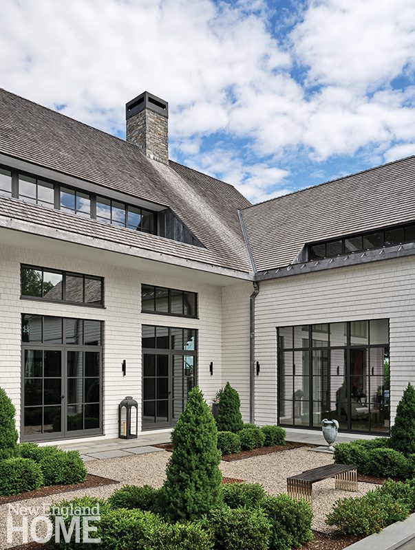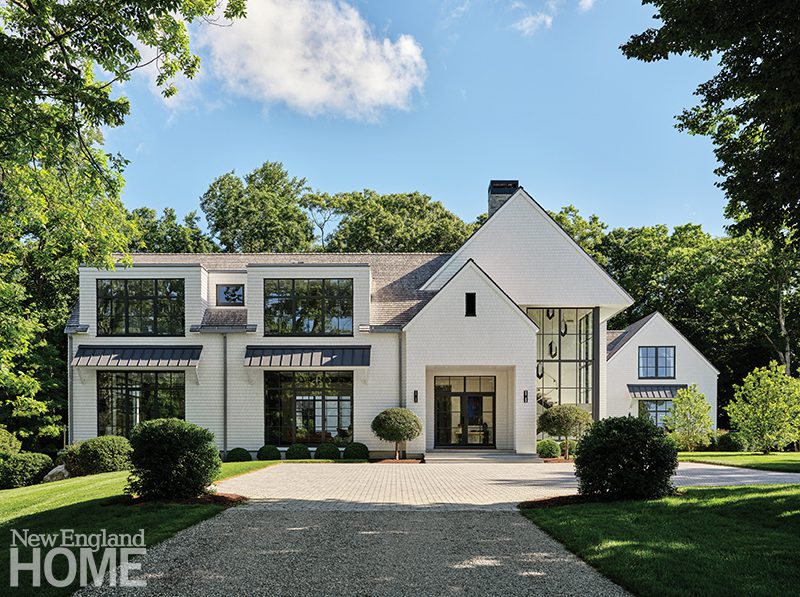 The house the couple chose was designed by Austin Patterson Disston Architecture & Design. Wrapped in creamy white shingles, with pitched roofs that alternate with expansive grids of glass, it is a sublime distillation of farmhouse and Bauhaus—at once both familiar and fresh. “Our firm calls it ‘modern agrarian,’ ” says architect Stuart Disston. “It’s a modern house, but it has traditional gables, so it fits in with the New England setting.”