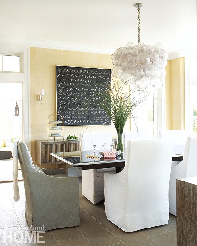 The wife chose comfortable, contemporary furnishings with no hard edges. Slipcovered chairs soften the glass-topped dining table. Classical forms, such as a traditional demilune at the end of a hall, and an urn-like base on the entry table, sit easily next to streamlined benches and lighting. The homeowners opted for some surprisingly modern art, and even acquiesced when Stefanon suggested they paint giant black-and-white stripes on the walls of one of the guest rooms.