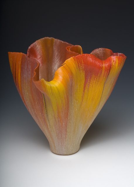 The work that eventually made her famous is a more solitary pursuit than the active group dynamic that initially brought her to the medium. Even so, her art is still all about motion, reflected in the interplay between threads as they melt together and in the flowing parabolas of her finished pieces. “Part of the reason I developed this work was because I wanted to spend more time contemplating each piece,” she says. “When you’re working with hot blown glass, it’s very fast, and there’s no going back. But I’m still always thinking about motion, and so the pieces have become more and more fluid in their form.”