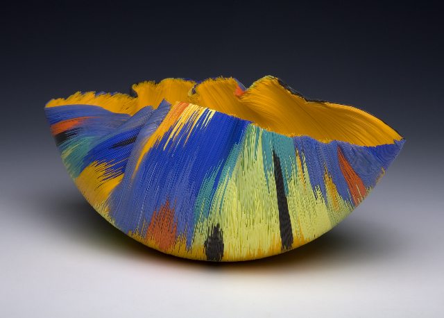 It took time to perfect the technique, though, and the process was one of trial and error, of broken and over-melted glass. In 1982, with a small National Endowment for the Arts grant, Zynsky headed to Europe, where her dollars would go further and last longer, so she could figure out a better way to create glass threads than pulling them by hand. In Holland she met Mathijs Teunissen van Manen, an artist and inventor who helped her create the machines that would eventually do it mechanically. Today, the machines incorporate sophisticated electronics and special computer software.