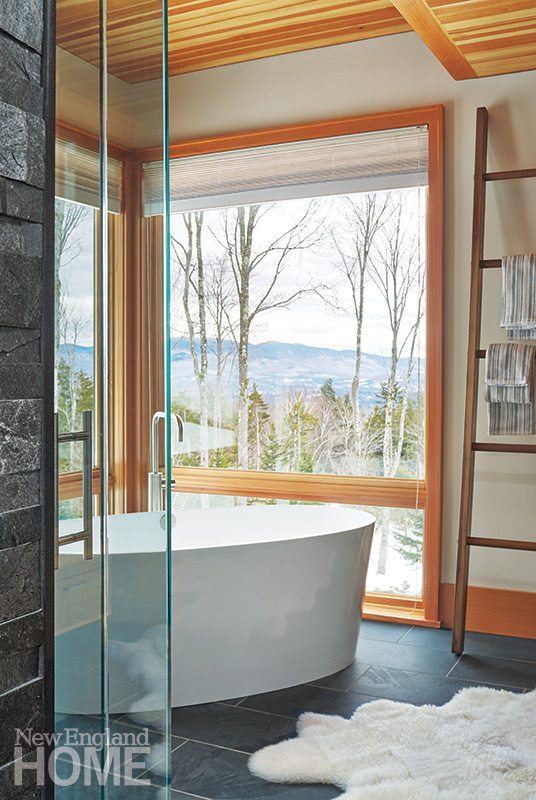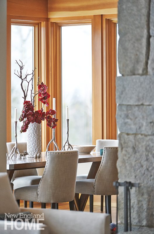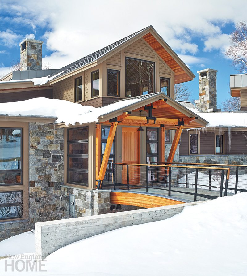 Gleysteen and his clients turned to Burlington, Vermont–based landscape architect H. Keith Wagner to help site and landscape the home. “We excavated some of the hillside so the house could sit more comfortably into the sloping lot,” says Wagner. “And we added a dry ravine that ‘flows’ in front of the home and curves under the covered bridge to the bedroom. Both are very organic ways to help break up the mass of the house.”