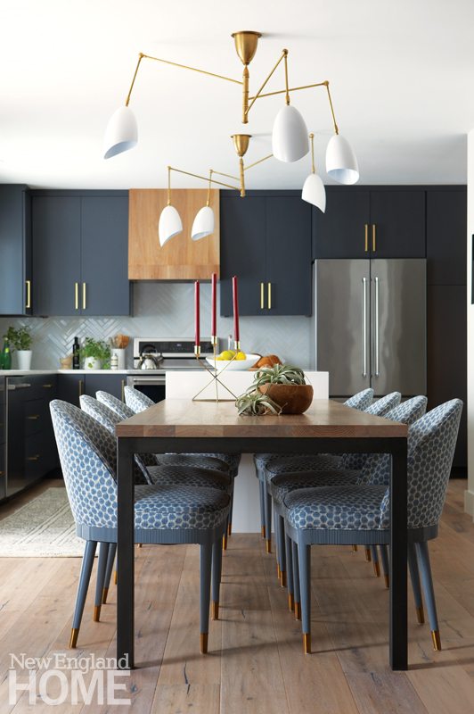 The kitchen, the site of the makeover that eventually inspired this whole-house renovation, sets the tone for much of the project. “I love the kitchen’s clean look, from the open shelves to the custom cabinets to the wood-clad range hood to the island that tumbles down into the dining table,” says Berchem.