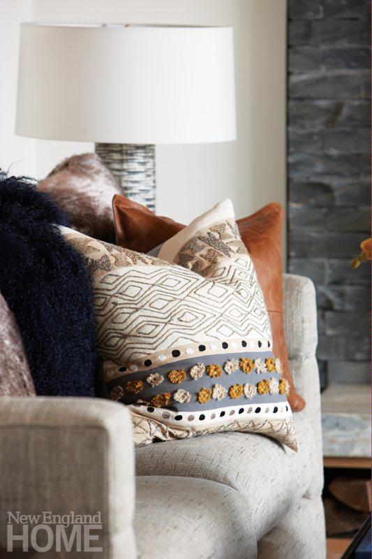 Moore and Fielding joined forces to design the living room’s arresting ceiling-high fireplace of natural cleft slate with a custom quartzite surround. The previous fireplace was built of fieldstone, but the owners wanted something with a “simpler, cleaner” look. “The cleft-edge gives a textual focal point to the room,” says Fielding. “It also provides a strong visual contrast to the quartzite.”